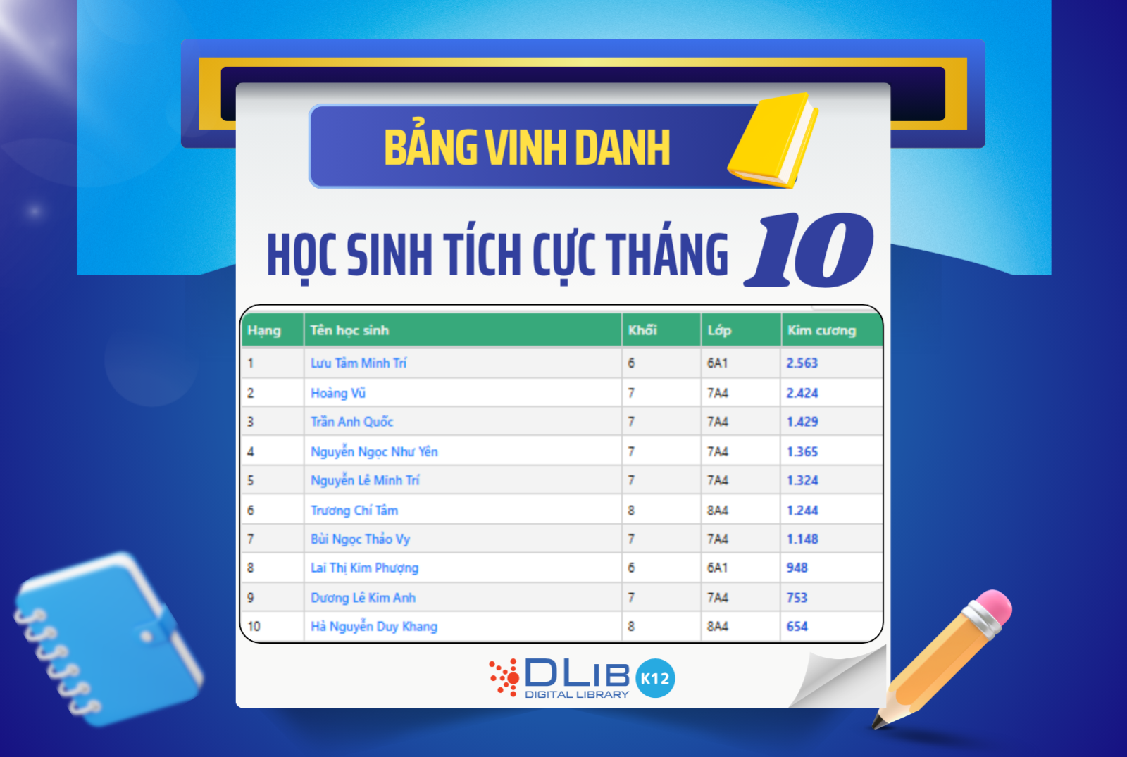 - Lưu Tâm Minh Trí – 6A1 (2.563 kim cương)